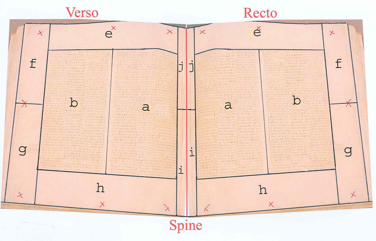 was given a letter: a, b, c & d identified the text columns and e, f, g, h, i and j identified the margin areas.