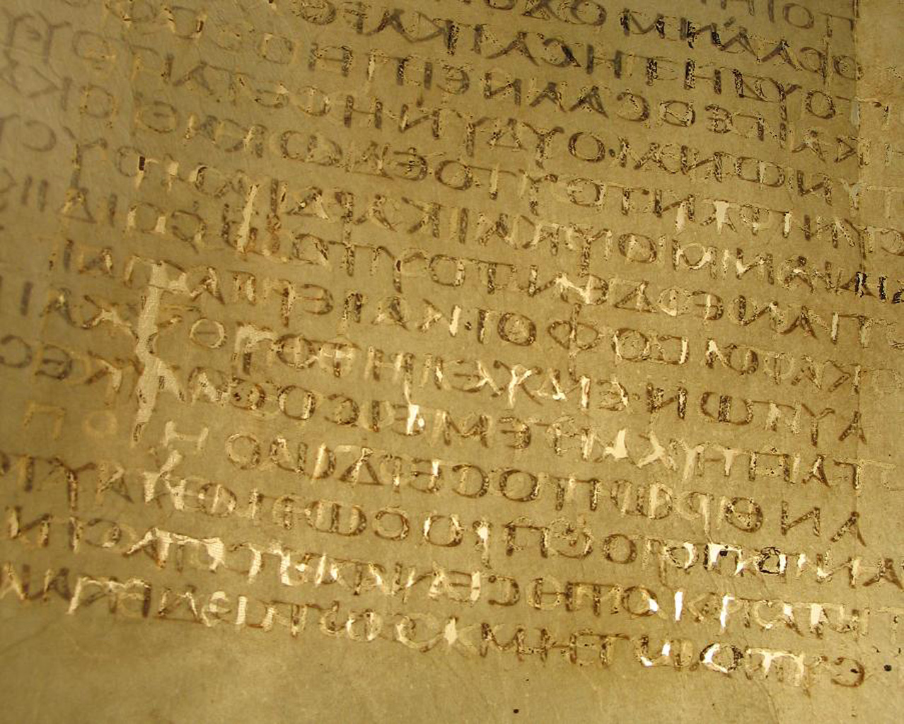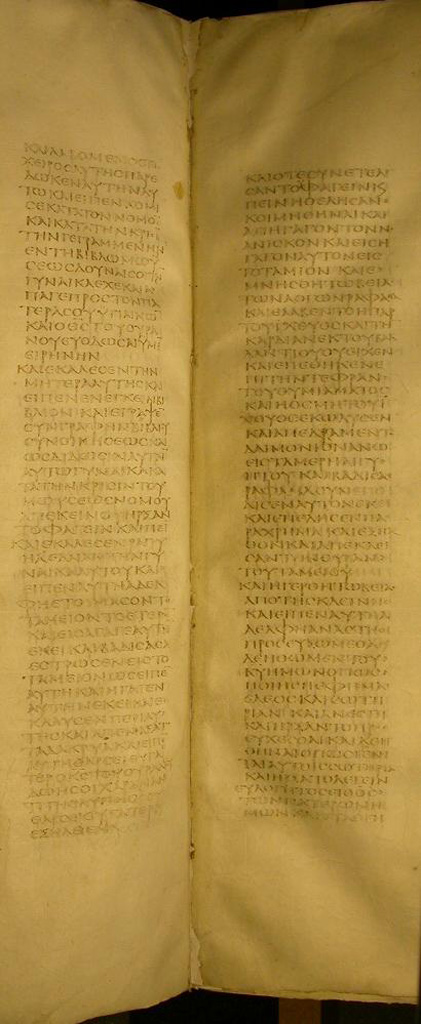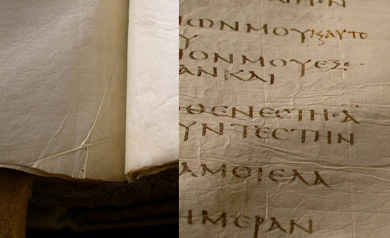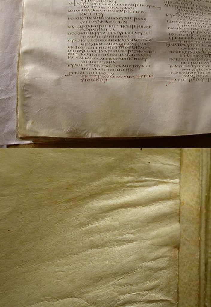 Codex Sinaiticus was written on prepared animal skin, called parchment. Parchment is very often made from calf, goat or sheep’s skin and has