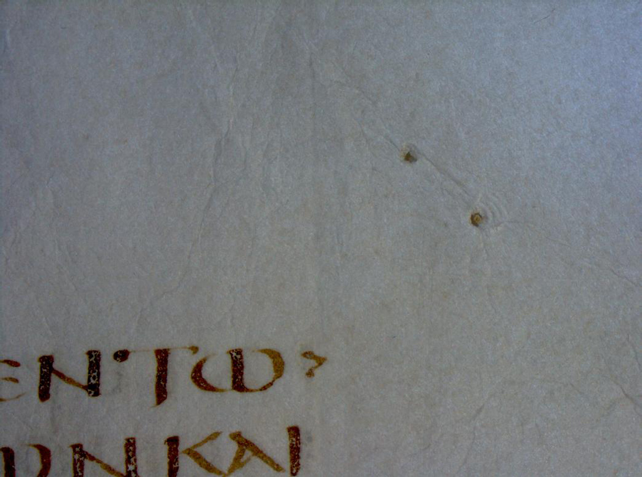 A puncture is a hole in the parchment with no loss of material. Pricking holes were excluded.